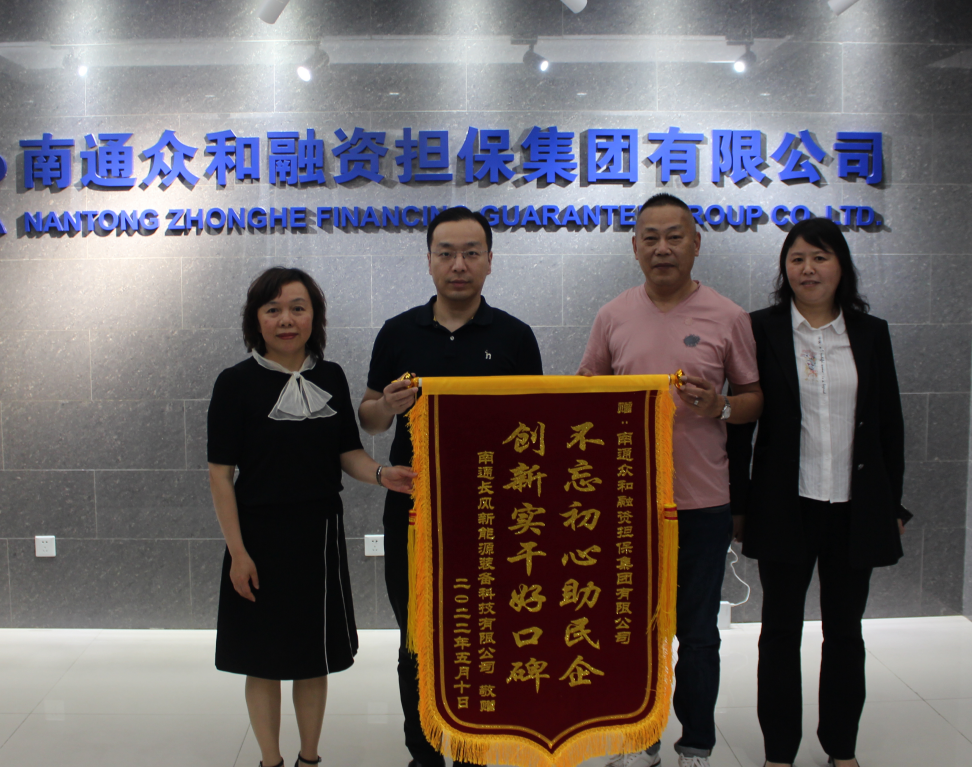 近日,眾和擔保收到一面來(lái)自南通長(cháng)風(fēng)新能源裝備科技有限公司送來(lái)的印有“不忘初心助民企,創(chuàng )新實(shí)干好口碑”的答謝錦旗,對我司提供暖心、貼心的擔?!凹皶r(shí)雨”表示誠摯感謝。