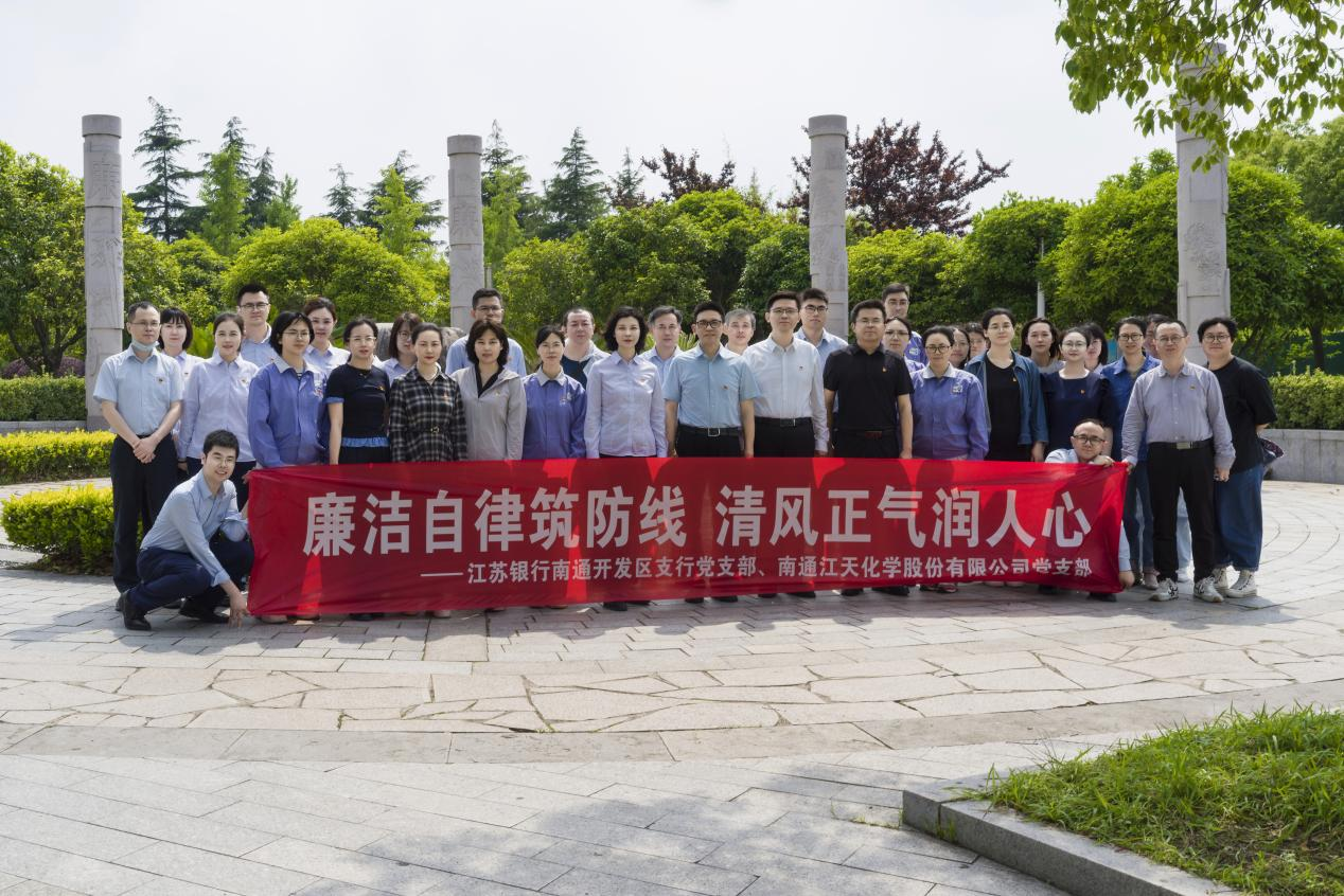 5月22日下午,江天化學(xué)黨支部與江蘇銀行南通開(kāi)發(fā)區支行黨支部攜手共赴南通廉潔文化廣場(chǎng),開(kāi)展“廉潔自律筑防線(xiàn) 清風(fēng)正氣潤人心”主題黨日共建活動(dòng)。江天化學(xué)支部書(shū)記、副總經(jīng)理張永鋒,支部副書(shū)記、副總經(jīng)理沙曉東,支部委員、副總經(jīng)理史彬,江蘇銀行南通開(kāi)發(fā)區支行黨支部書(shū)記、行長(cháng)孫晴等出席活動(dòng)。